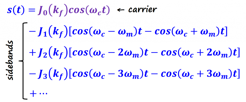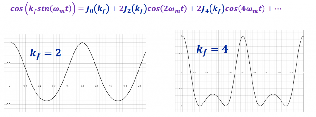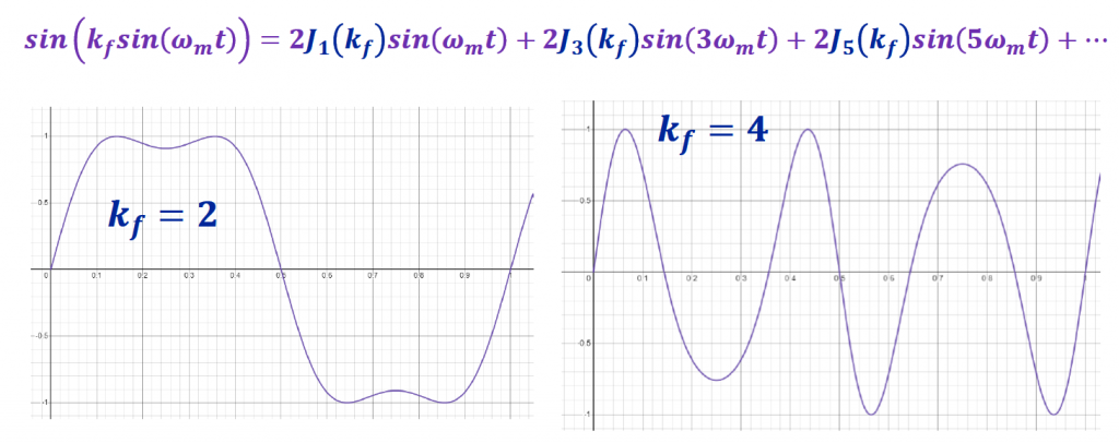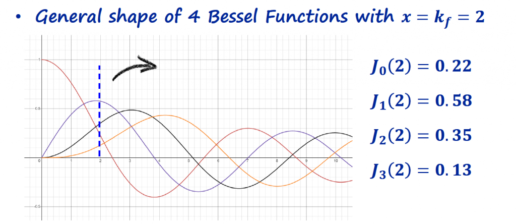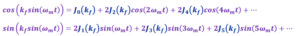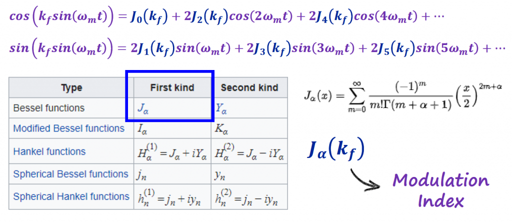 If you don’t recognize the result of expanding the sinusoidal functions, don’t panic. The J0, J1, J2, J3, J4, J5, etc… are what is called Bessel functions of the first kind. You can find more information about this expansion on this link. They are presented by Abramowitz and Stegun on the “Handbook of Mathematical Functions” (Link), page 113, equations 9.1.42 and 9.1.43.