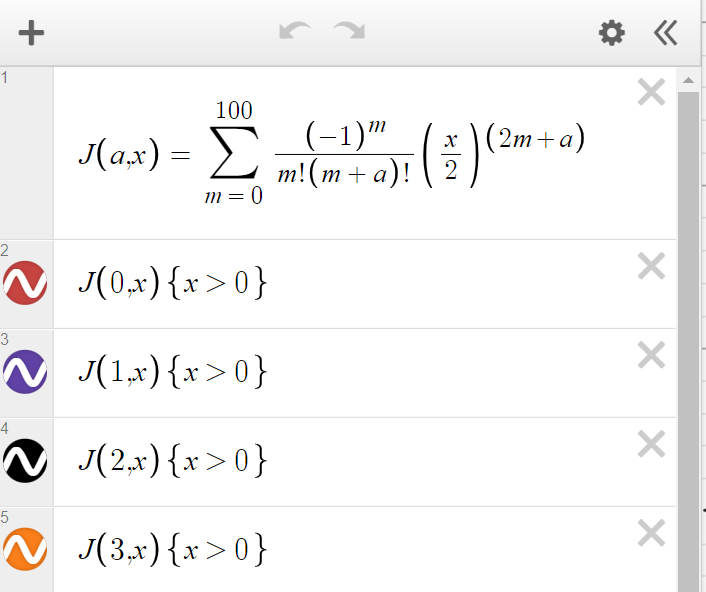 Now we are in good shape to plot some of these Bessel functions of first kind. Let’s use Desmos to plot the first 4 Bessel functions.