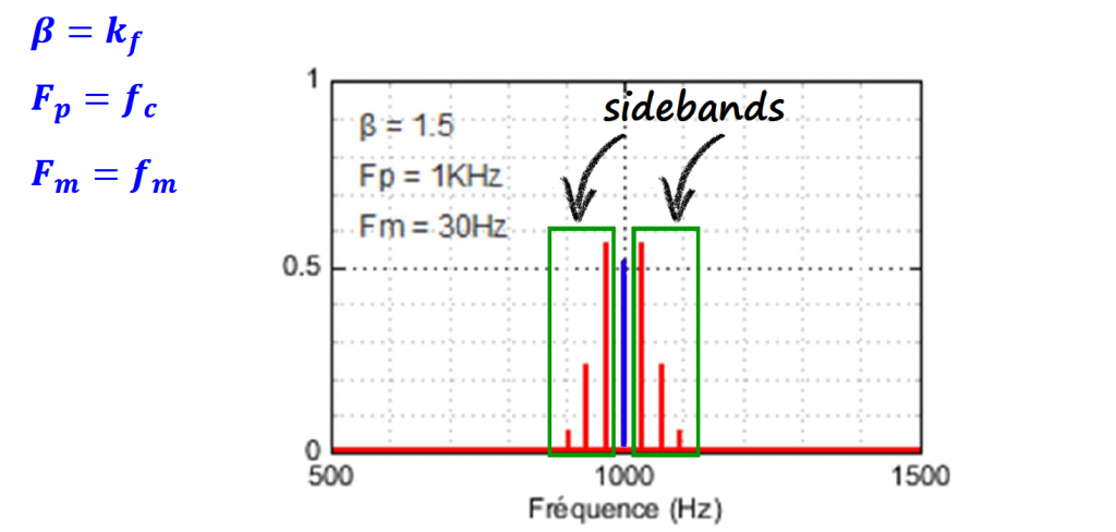 As we increase the modulation index, we can see in the spectrum the number of sidebands increasing.