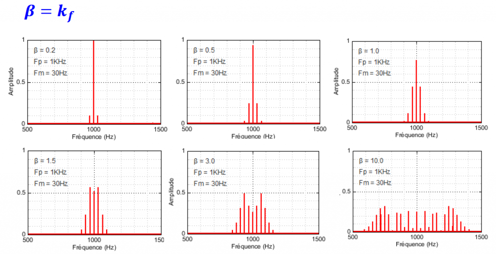 On the example above, I am changing only one variable, the scaling factor (k = kf), and we can observe the number of sidebands changing accordingly.