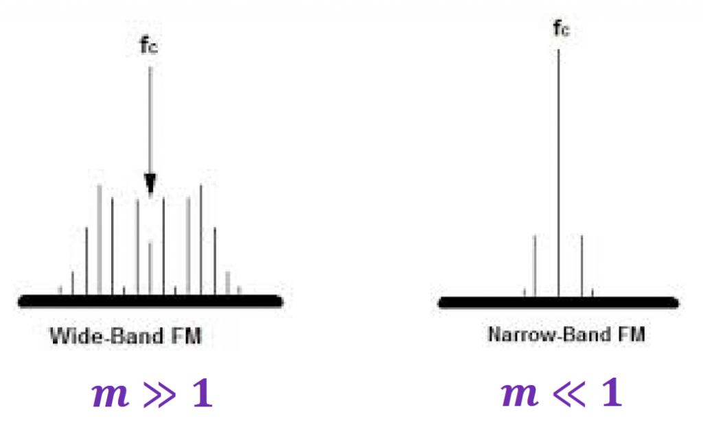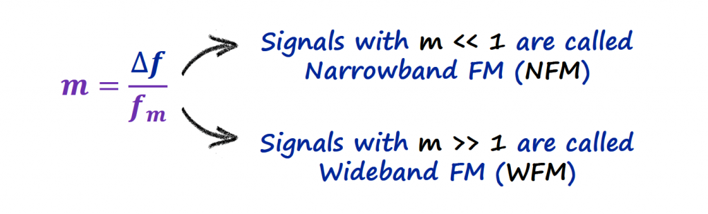 If m << 1 then we are dealing with a Narrowband FM (NFM) modulation, and if m >> 1 then we have a Wideband FM (WFM) modulation.