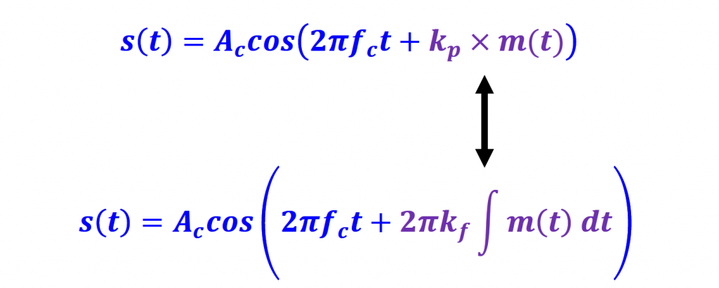 In certain situations it might be convenient to use only a PM or FM modulator and still be able to modulate signals with any angle modulation technique. Notice below that we can either integrate or derive the message (m(t)) to go between PM to FM and vice versa.