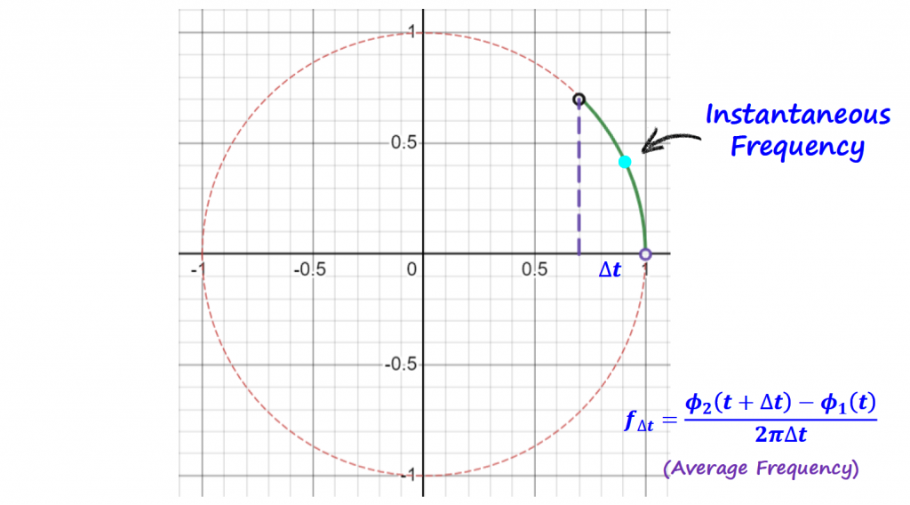 If we represent the average frequency on the graph that had the blue dot (circular motion), the average frequency is the path (in green) that the blue dot does over the full circle (2π). Instantaneous frequency in that path will be the small blue dot at that particular instance of time.