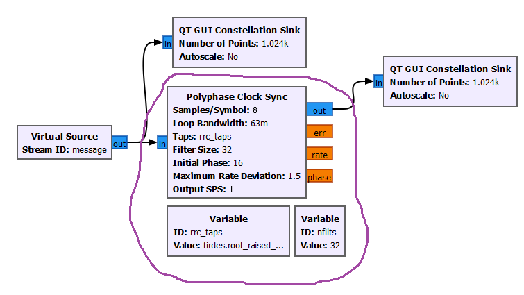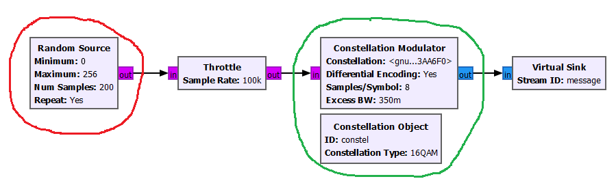 We implemented a QAM scheme with GNURadio flowgraph, and this section goal is to relate this flowgraph with the Tx-Rx Chain block diagram introduced in the Intro section of the Analog Data to Analog Signal topic.