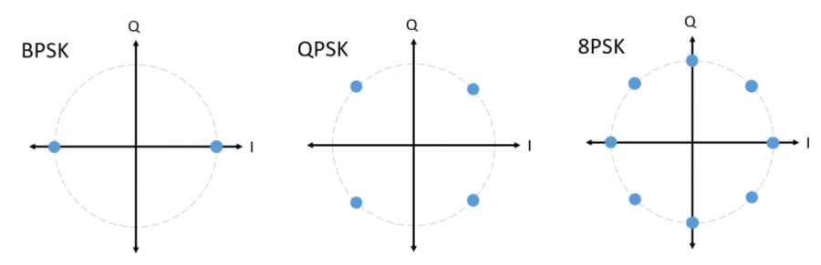 During the “PSK Modulation” section we covered a way to modulate digital data using the phase of the carrier, and we call those schemes Phase Shift Keying (PSK). Some PSK schemes have the following IQ plots: