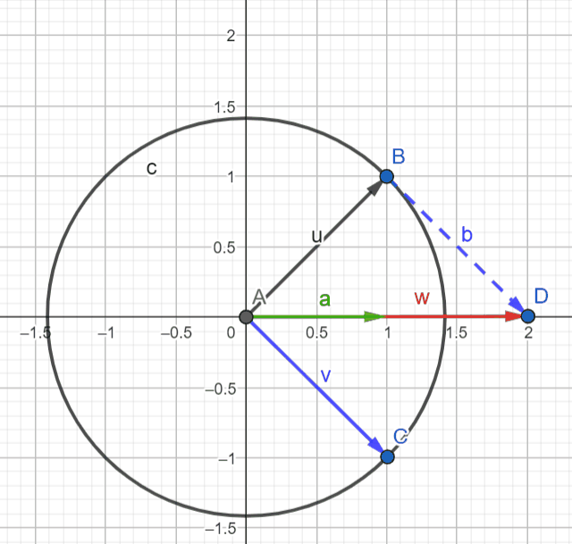 Move point C around to position vector v (in blue) and observe the resultant vector a (in green) to validate the equations above.