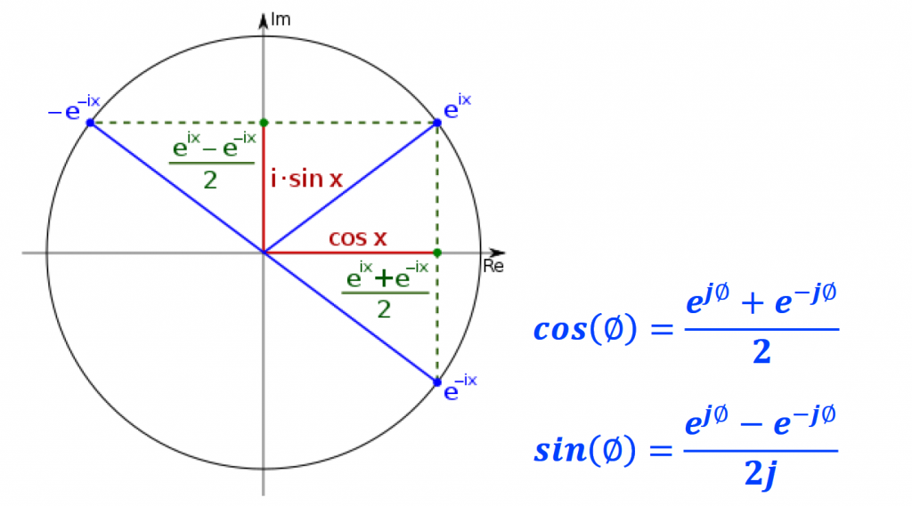 We can actually visualize these relationships if we use the complex plane to represent them. If we see ejθ and e-jθ as vectors, cos and sin can be obtained by summing and subtracting these vectors respectively. Don’t forget to divide the result by 2 on both operations.