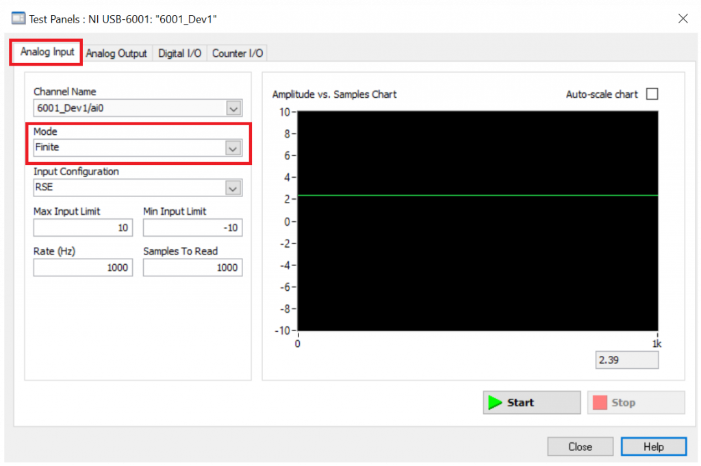 For this article I am going to show how to implement the finite single analog input mode from the test panel NI-MAX software. I encourage to test this mode first using the NI-MAX software in order to get a better feeling what are the pros and cons of this mode before looking at the python examples.