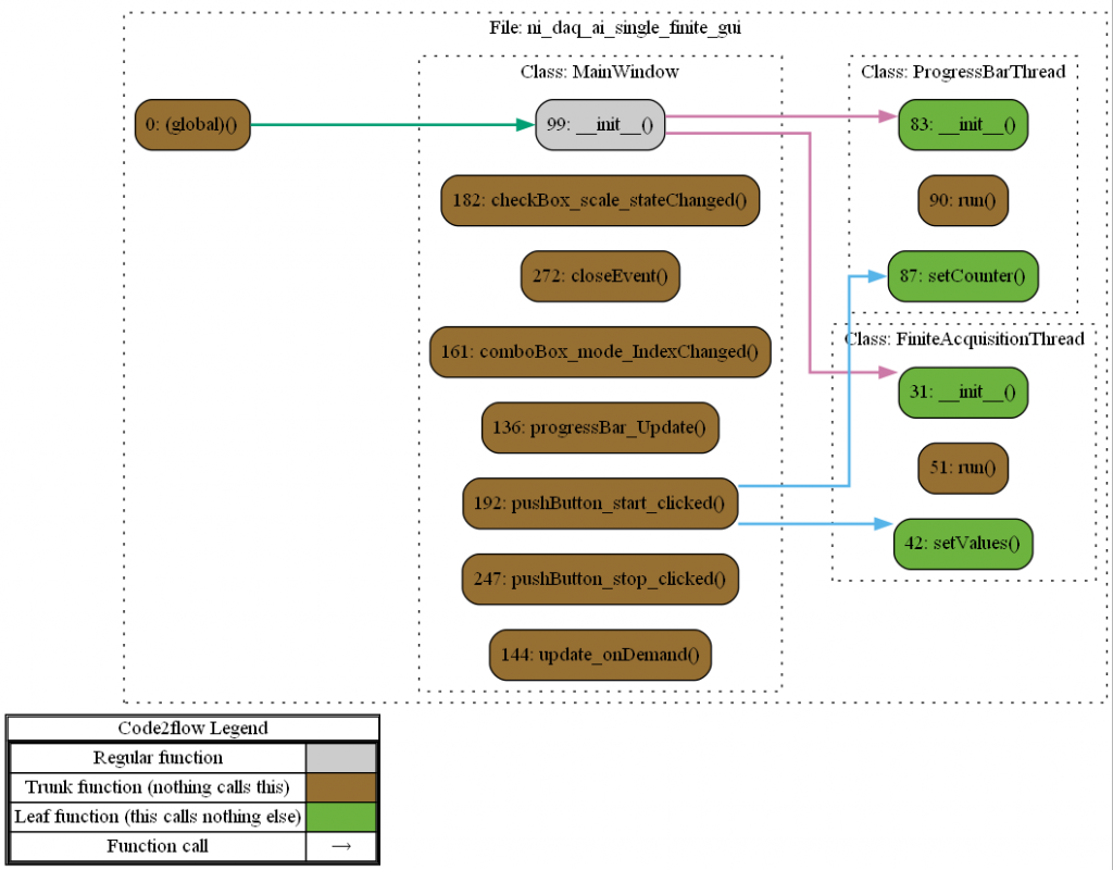 The second diagram was generated using code2flow and finds all function definitions in the code, and determines where those functions are called.