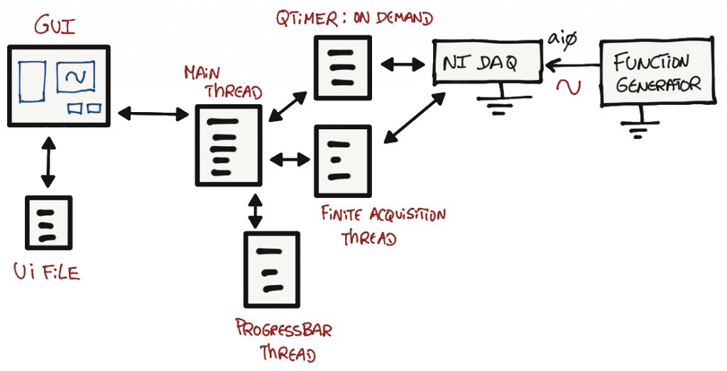 The first diagram is a generic block diagram on how the code, GUI, ui file and external hardware interact with each other in an conceptual way.