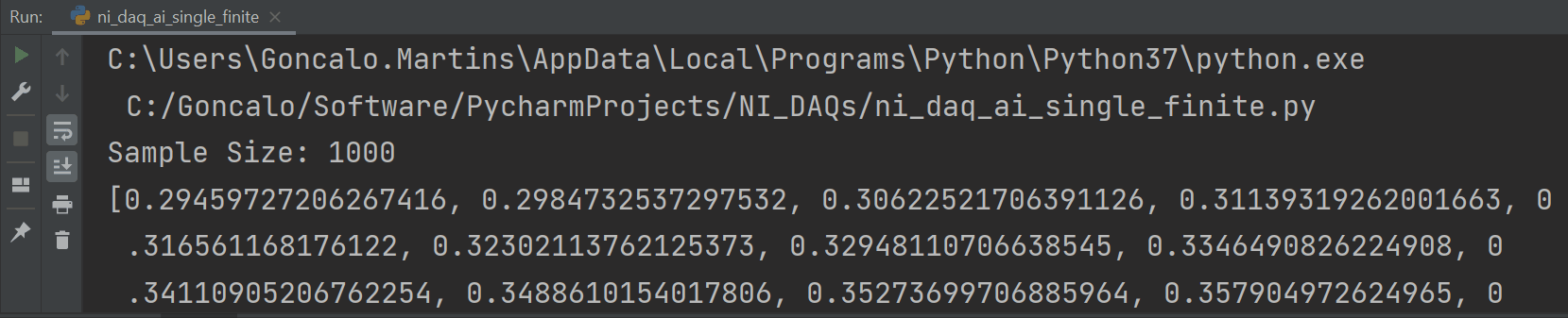 If you run the code, you will see that the code will run for 1 second and display the acquired data on the terminal.