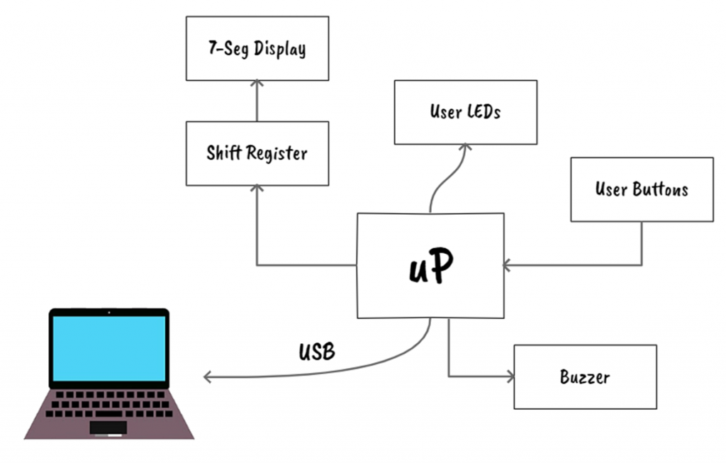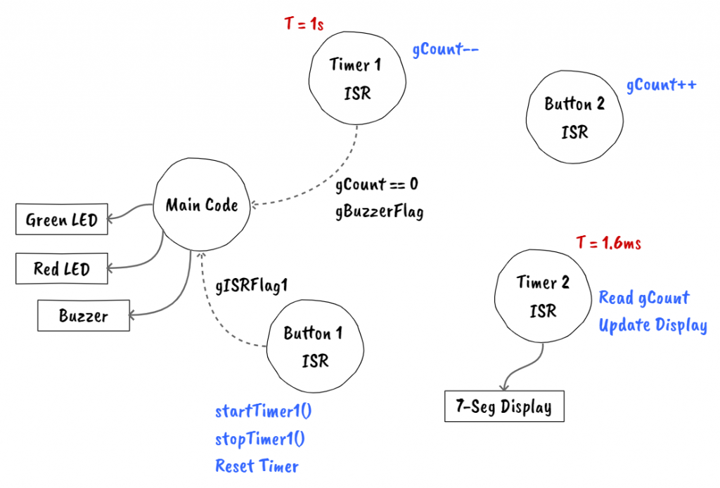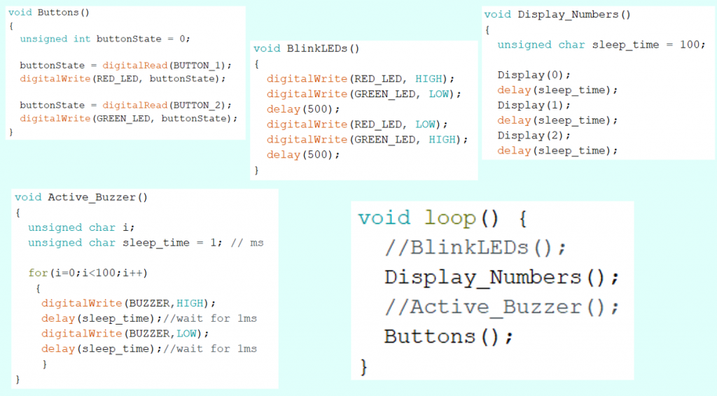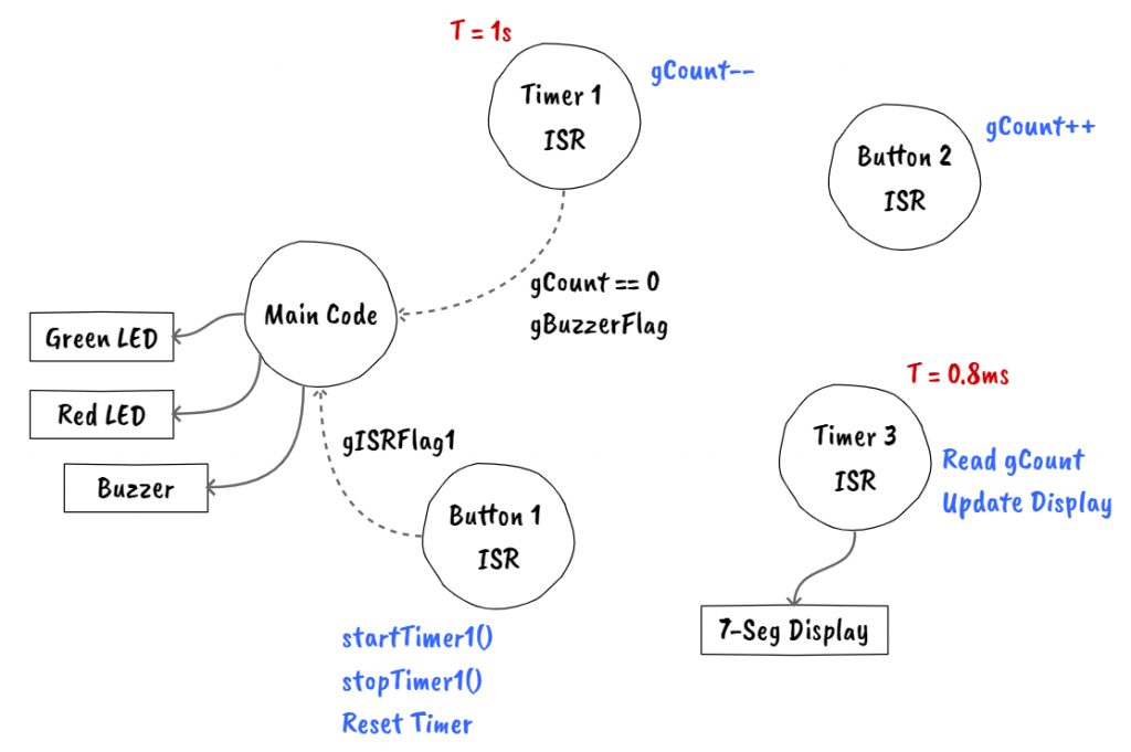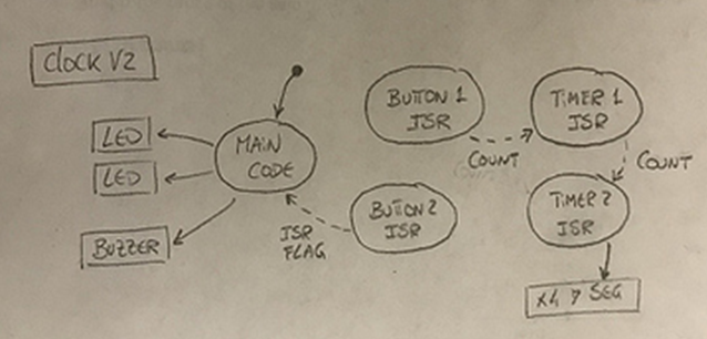 The code presented in the “Initial Code Development” section had some real-time limitations. The functions to interact with the buttons, leds, and 7-seg display were running in a pooling fashion way.