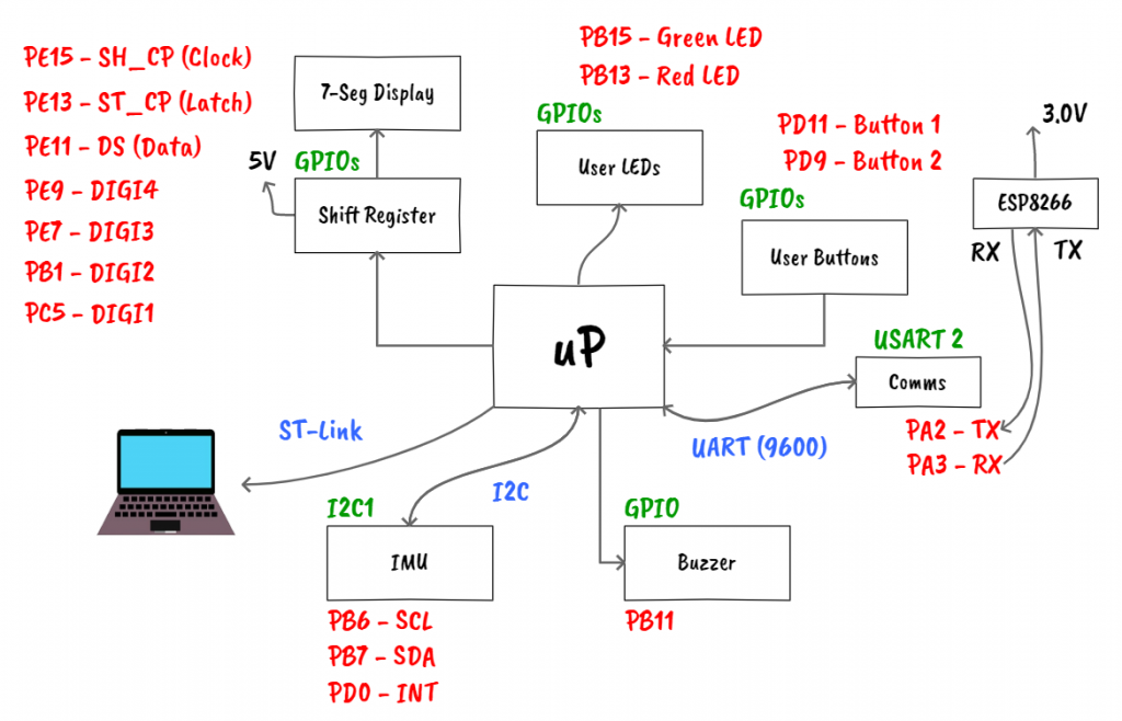 As always, let’s start with a draft of the system block diagram. The blocks are pretty much the same as the blocks for Phase B. The pinouts were mapped to the STM32F4 Discovery Board peripherals (Link).