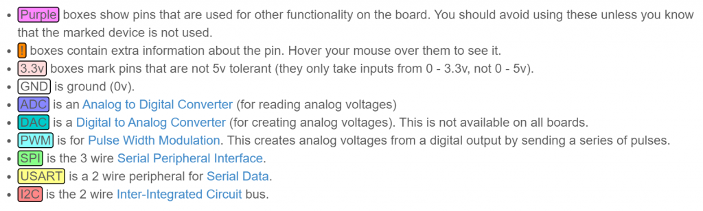 The images below, are from the Espruino Website [REF 2]. The documentation on this website is stellar and very well organized. We can select any pin besides the ones in purple since they have a functionality on the board already. For this project, we should also avoid selecting the pins that are not 5v tolerant.