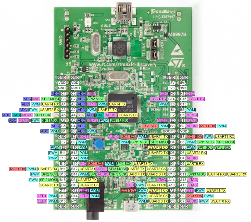 The STM32F4 Discovery Kit has a good portion of peripherals already available for the user to explore, namely, 3 axis accelerometer, 4 user LEDs, 1 user button, a 3.5mm audio jack, chip microphone and an USB OTG.