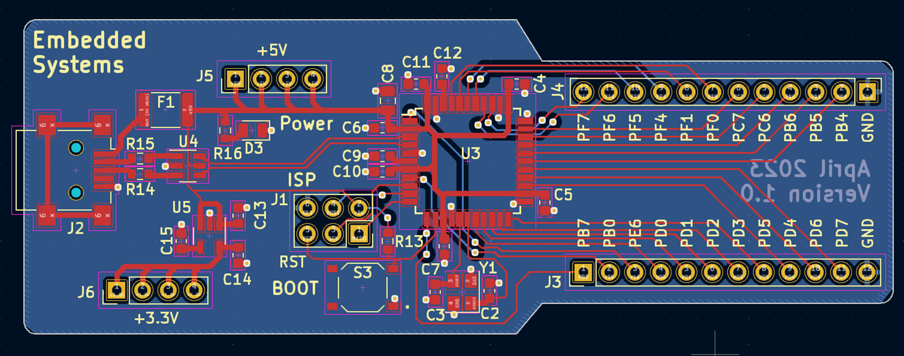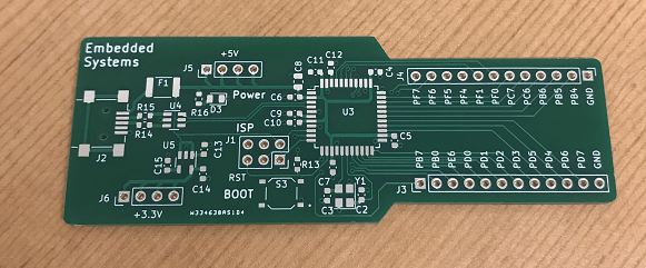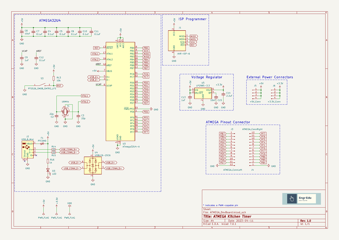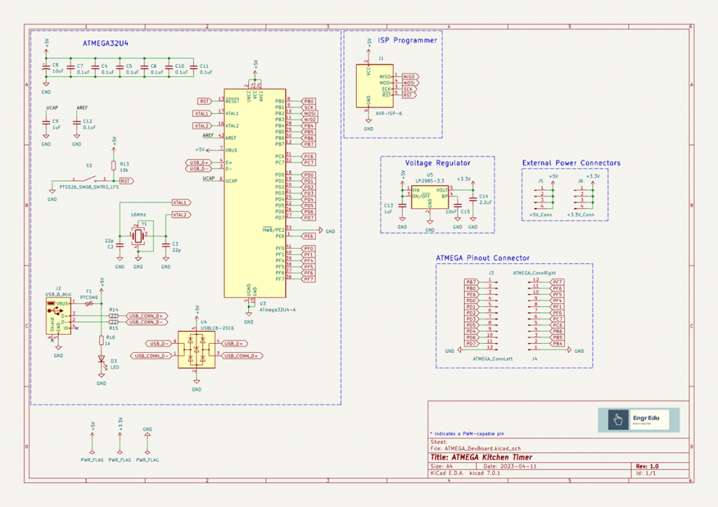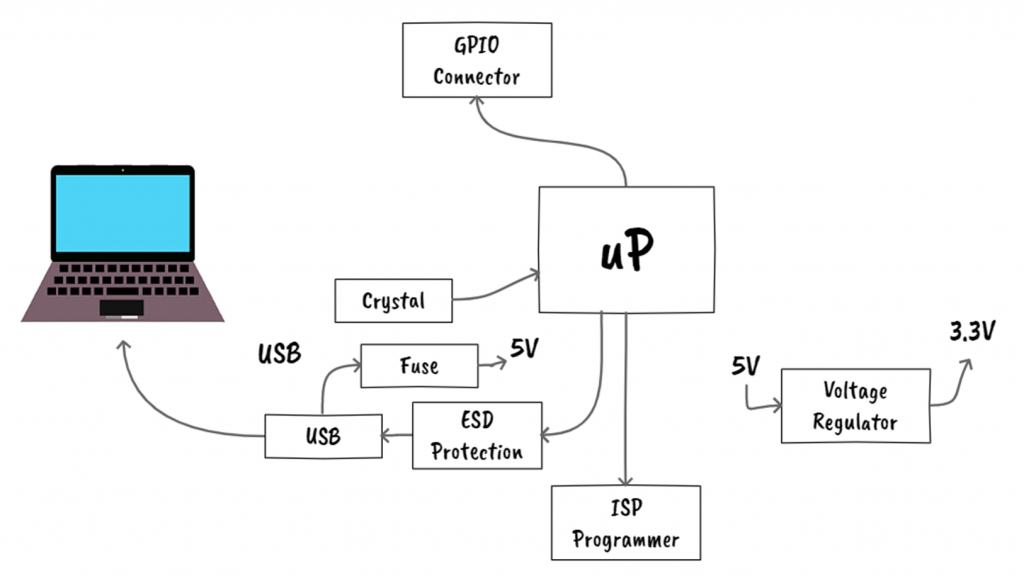 Besides having access to the 22 GPIO pins, we need to include the ISP programmer connector, a crystal, and a USB connector. The fuse and ESD protection are good practice to have in your designs but you can remove these modules if you want to design a more compact or cheap version of this board.
