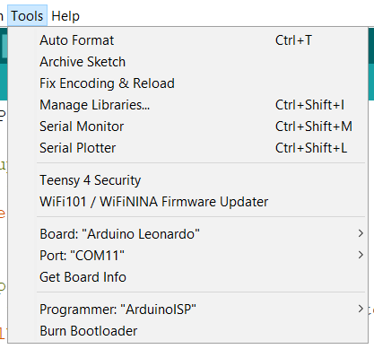 After flashing the USB bootloader, open your Arduino IDE and set the board to “Arduino Leonardo” and the programmer to “Arduino ISP“.