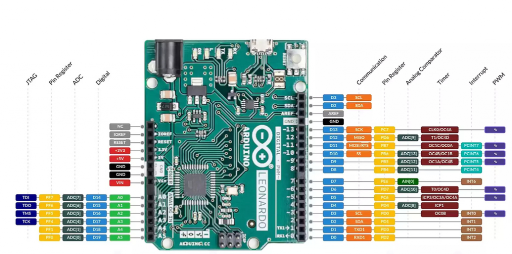 The figure below has the pinout for an Arduino Leonardo board. We can use it as a pinout guidance to map all the 22 GPIO pins accordingly.