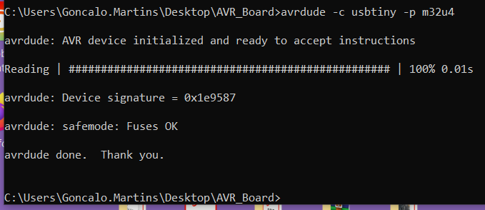 - Run the command below to check if the AVR Programmer is talking with the ATMEGA chip.