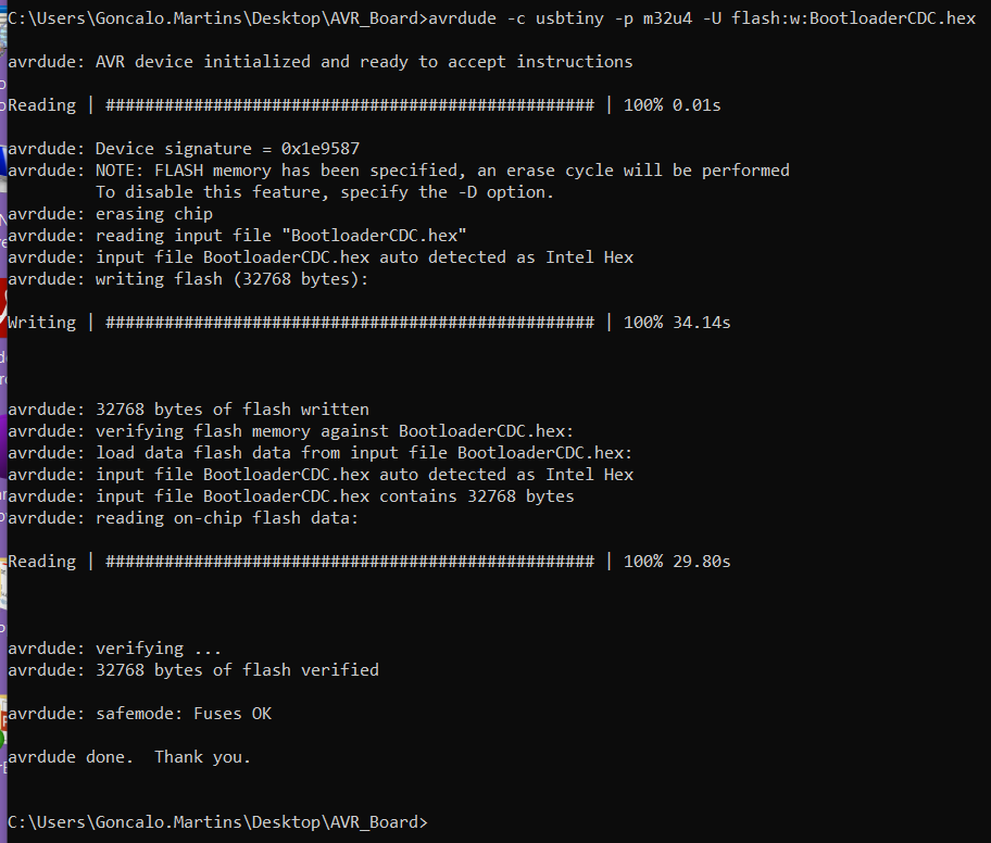 The ATMEGA32U4 chip doesn’t come with the USB bootloader flashed in it. We need to flash it using the AVRDUDE software and an AVR programmer.