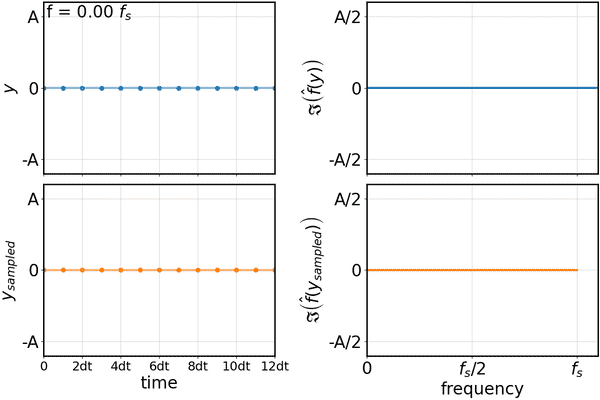 - For the first row, the time domain view is rendering the analog input (continuous blue line) and the sampled values (blue dots). The graph sweeps the analog input from 0*fs to 1*fs in increments of 0.01.