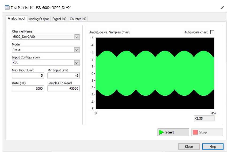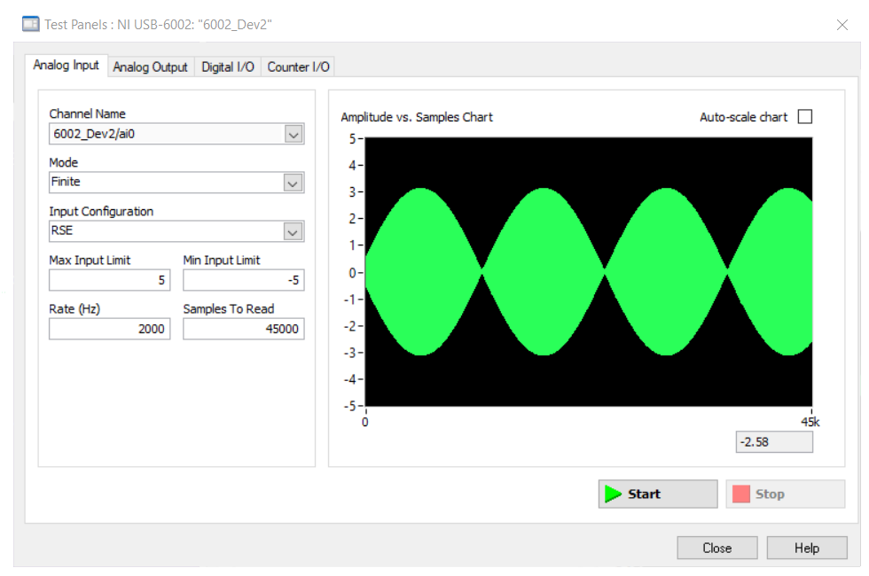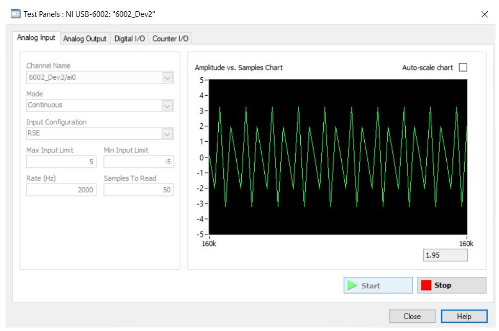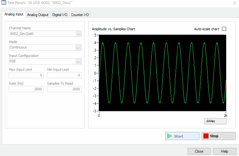 - The second DAQ is the NI USB-6002 that has a maximum sampling rate of 50kHz. According to Nyquist we should be able to get good samples signal reconstruction up to an analog input of 25kHz.
