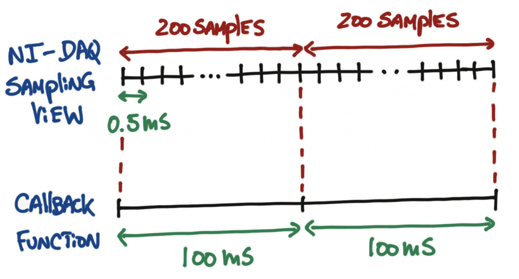 - We will set up the NI-DAQ to acquire at a sampling rate of 2kHz (0.5ms) and after collecting 200 samples we can then use the user level program to get the data and render or process it at a rate of 10Hz (100ms).