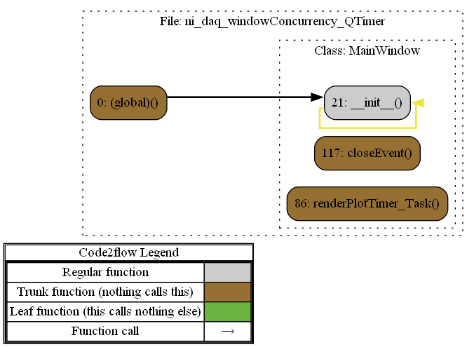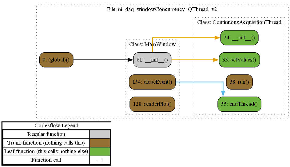 - The thread generates a signal (at Line 49) when data is available from the DAQ, and the function connected to that signal renderPlot (on Line 128) is executed as a normal function call, totally independent of any GUI event loop.